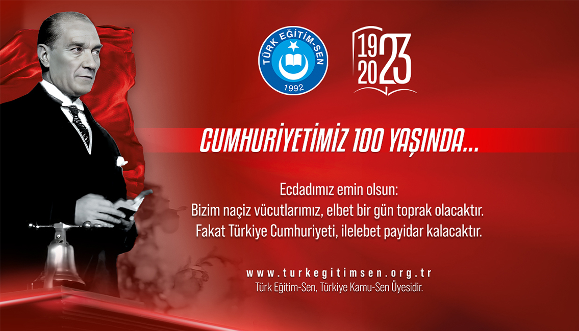 Her nesil, bugün 100. yılını kutladığımız Türk mucizesi Cumhuriyetimizi bin yıllara taşıyacak şevke, iradeye, azme sahip olacaktır. Cumhuriyet değerlerine mihmandarlık yapmak, son nefesimize kadar sahip çıkmak var oluşumuzun en önemli parçasıdır. Ekonomik, siyasi, eğitim ve sosyal alanlarda tam bağımsız olan milletimiz, milli menfaatlerinden taviz vermeyeceği gibi, kazanımlarını daha da yükseklere taşıyacaktır. Başöğretmenimiz Atatürk’ün bizlere yüklediği sorumluluk ile yüksek ve karakterli bir nesil yetiştirme arzusunda olan Türk eğitimcileri olarak beslendiğimiz Cumhuriyet değerlerini, genç nesillere aktarmaya, onları ilim ve irfanla donatmaya, yok oluştan, terkibe ulaşan yaldızlı tarihimizi anlatmaya yılmadan, usanmadan devam edeceğiz. 10. Yıl Marşı’nda da ifade edildiği gibi, “Türk’üz: Cumhuriyet’in göğsümüz tunç siperi/Türk’e durmak yaraşmaz, Türk önde, Türk ileri!”