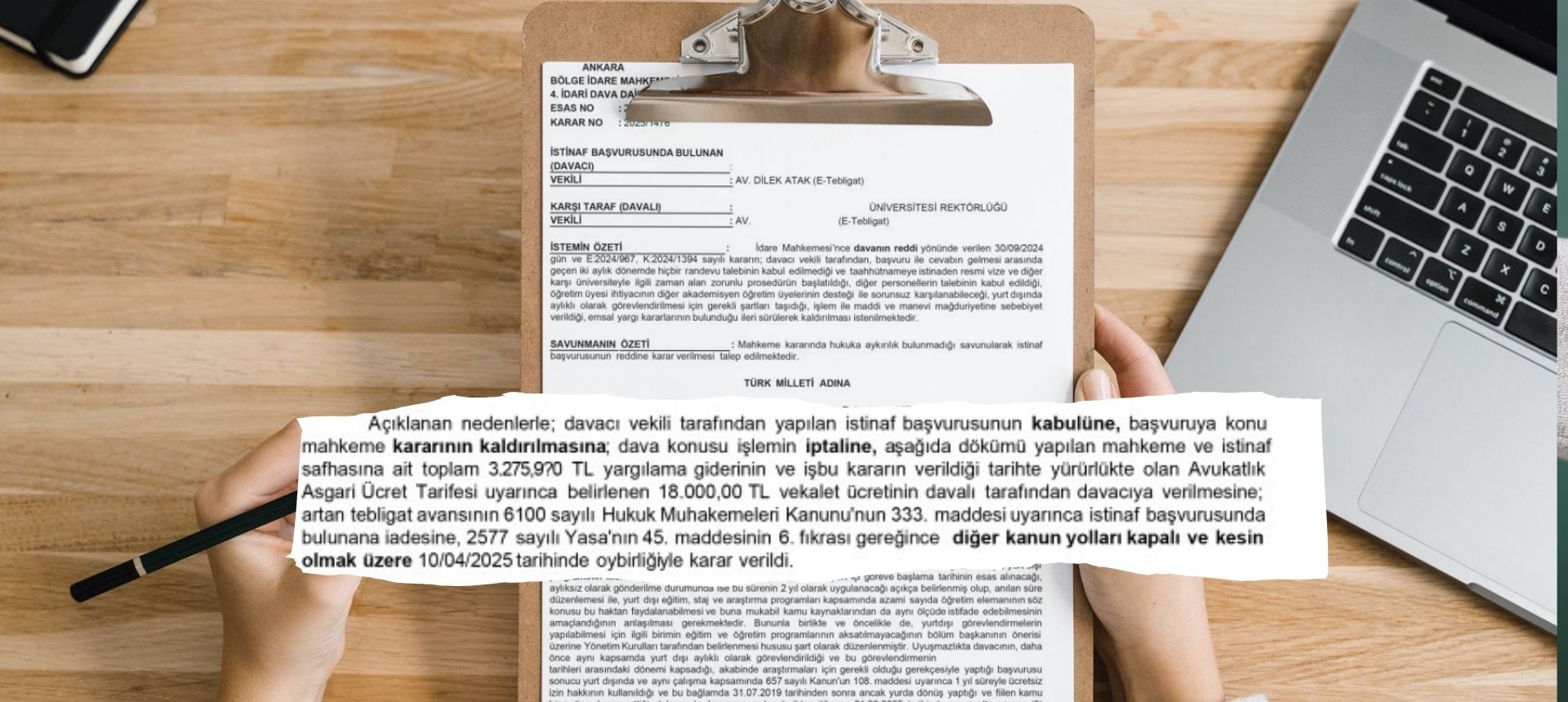 Öğretim üyesi olarak görev yapmakta olan sendikamız üyesinin, TÜBİTAK-2219 burs programı kapsamında (1) yıl süreyle aylıklı olarak yurt dışında görevlendirilmesi talebi ile yaptığı başvurunun reddine ilişkin iptali istemiyle açılan ve sendikamız avukatlarınca takip edilen davada, Ankara Bölge İdare Mahkemesi 4. İdari Dava Dairesinin 2024/4446 E., 2025/1476 K. Sayılı kararıyla işlemin iptaline hükmedilmiştir.