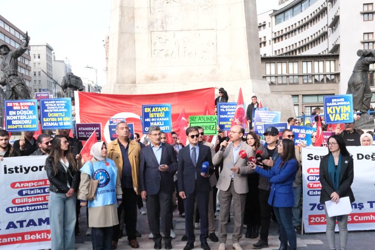 Eylemde bir konuşma yapan Genel Başkanımız Talip Geylan, ataması yapılmayan öğretmenlerin her zaman yanında olduklarını söyledi. Geylan, “Ataması gerçekleşmeyen öğretmenler ulufe değil hakkını istiyor. 3 milyon adayla yarışarak, YKS’de başarılı oldunuz, üniversiteye yerleştiniz. Başarıyla mezun olduktan sonra KPSS’de yüzbinlere aday ile yarışarak, yüksek puan aldınız ve atanmaya hak kazandınız. Ancak atanamadınız. Bu arkadaşlarımız atanamayan öğretmenler değil, ataması yapılmayan öğretmenlerdir! Bunun böyle bilinmesini istiyoruz. Çünkü bu yıl, 23 yıllık Adalet ve Kalkınma Partisi iktidarının en az öğretmen ataması yapılan yılı oldu. Hem de hala atamalar yapılmadı. Bazı branşlarda durum içler acısı. Biyolojide 23, edebiyatta 29, tarihte 28, coğrafyada 32, felsefede 41 kontenjan ayrılmış. Yani ilk 30’a, ilk 40’a da dahi girmiş olsanız bile atanamıyorsunuz. Daha ne yapsın bu öğretmenler adaylarımız!