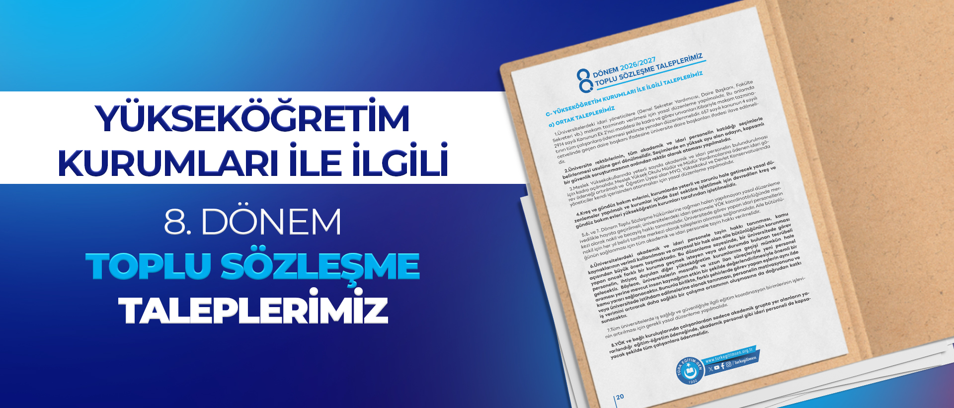 Bilindiği gibi 28.07.2025 tarihinde 8. Dönem Toplu Sözleşme Görüşmeleri başladı. Toplu Sözleşme talepleri kamu çalışanlarının hakları ve geleceği adına hayati bir değer taşımaktadır. Türk Eğitim Sen olarak amacımız eğitim çalışanlarının daha huzurlu, verimli bir çalışma ortamını sağlamak, eğitim sistemine dair kapsamlı çözüm yolları geliştirmektir. Başta maaş artışları ve özlük hakları olmak üzere tüm haklı beklentilerini karşılayacak adımların atılması temel beklentimizdir. Toplu sözleşme sürecinin verimli şekilde yürütülmesi, eğitim çalışanlarının beklentilerinin masaya yansıtılması en büyük temennimizdir.
